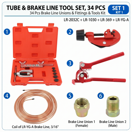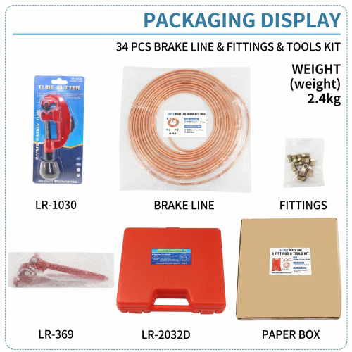 For automotive technicians, replacing corroded brake lines is often stalled by missing fittings or mismatched tools. Selling standalone flaring yokes limits your sales potential. The Longrun (LR) 34-Piece Brake Line Kit consolidates the entire repair workflow into a single 2.4kg retail package. By providing the tubing, the bending/cutting tools, and the exact M10 metric hardware together, distributors can significantly increase their average order value (AOV) while solving a major headache for local repair shops.