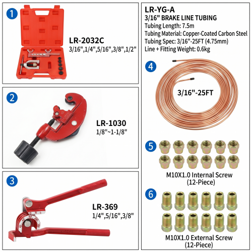 In regions prone to severe winter road salt (the "Rust Belt"), chassis corrosion destroys factory brake lines. Mechanics rely on this exact kit to custom-fabricate entire rear brake lines on 10-to-15-year-old trucks. Utilizing the LR-1030 cutter for clean 90-degree slices and the LR-369 180° bender to navigate around exhaust systems, technicians can restore a vehicle's braking system in a fraction of the time without leaving the garage to source parts.